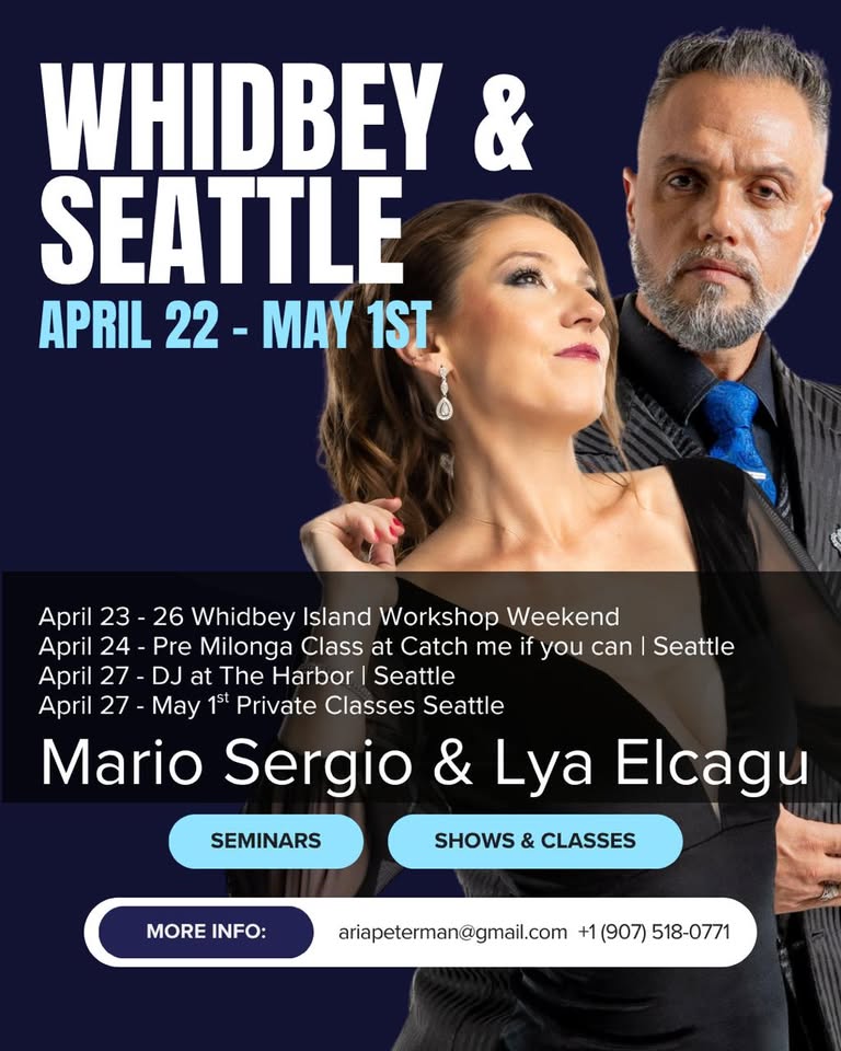 Whidbey Tango Hosts Lya Elcagu and Mario Sergio runs from 2026-04-23 to 2026-04-26. Festivals typically include workshops with visiting maestros, milongas every evening, and sometimes live orchestra performances and shows.