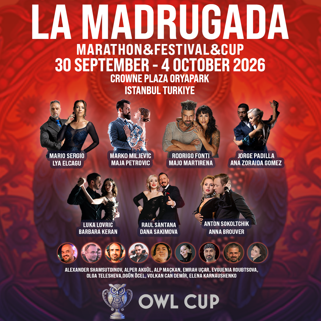 La Madrugada Tango Marathon, Festival, and Cup invites dancers from around the world to an exceptional tango experience in Istanbul from September 30 to October 4, 2026. Hosted at the 5-star Crowne Plaza Oryapark Istanbul, the event promises elegance, comfort, and convenience with high-quality dance floors and spacious halls. The mission is to foster an atmosphere where musicality, connection, and the true spirit of social tango are central, featuring an outstanding lineup of internationally renowned dance couples who will perform and share the dance floor. The festival also includes the unique “La Madrugada vs Social” showcase and the "Owl Cup" tango competition, designed to evaluate dancers across various tango styles.