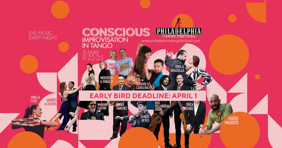 14th Philadelphia Tango Festival: Conscious Improvisation in Tango runs from 2026-05-22 to 2026-05-25. Festivals typically include workshops with visiting maestros, milongas every evening, and sometimes live orchestra performances and shows.