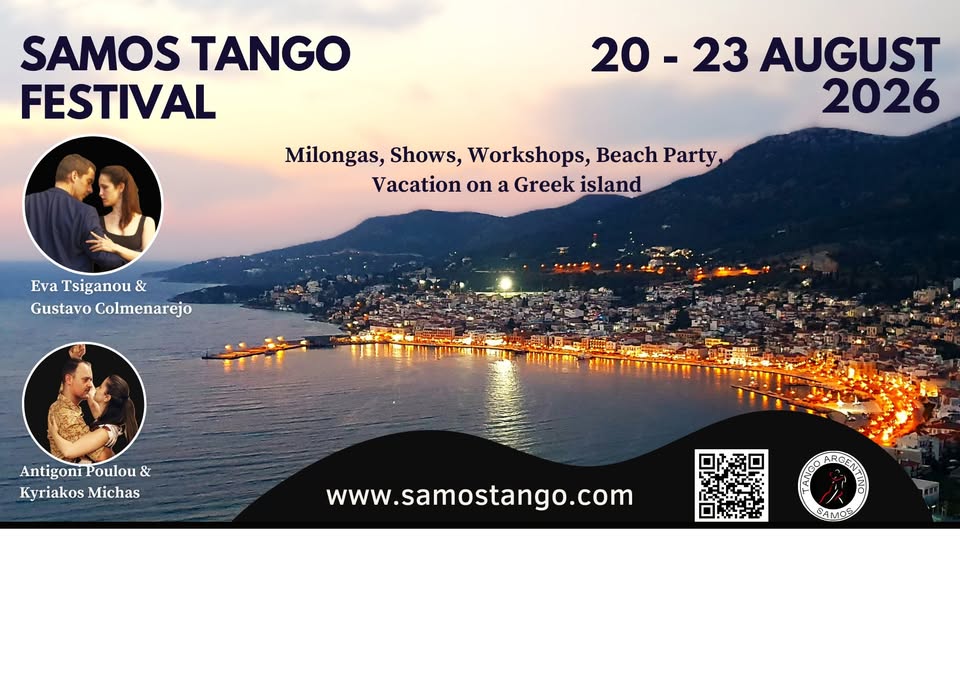 4-Day Festival on Samos island. 5 milongas (4 open-air under the Greek sky), 4 workshops with experienced maestros, theater show in an amphitheater, beach party. Combine vacations and tango on a Greek island. Website: samostango.com