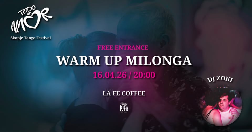 WARM UP MILONGA for Todo Es Amor Skopje Tango Festival starts at 8:00 PM to 11:45 PM at La Fé Coffee in Skopje.