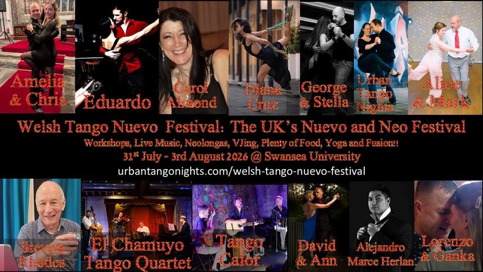 Welsh Tango Nuevo Festival: The UK's Nuevo and Neo Festival runs from 2026-07-31 to 2026-08-03. Festivals typically include workshops with visiting maestros, milongas every evening, and sometimes live orchestra performances and shows.